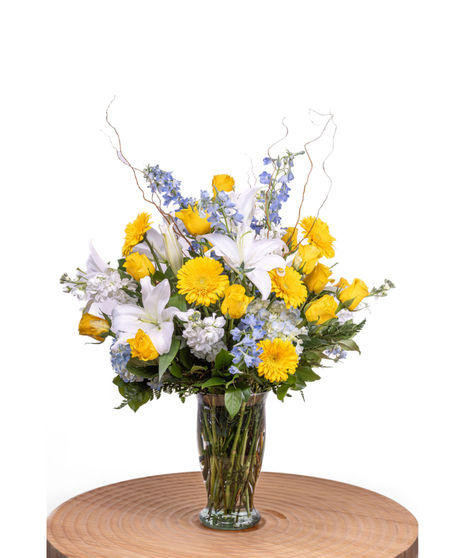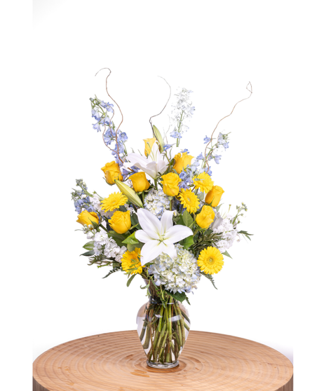 Send a breath of fresh air to someone who needs it! Our Bright Skies flower arrangement is a delightful choice for new baby, birthdays, anniversaries, and every springtime occasion. This bouquet is a stunning representation of a bright blue sky in spring, bringing the beauty of nature right to your or your recipient’s door. Embrace the joy and convenience of local flower delivery in your area today!