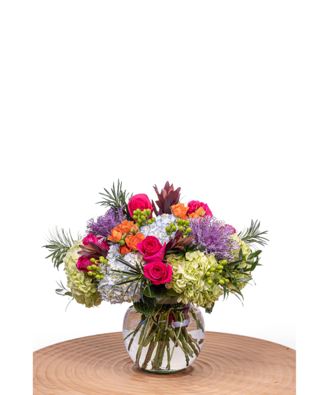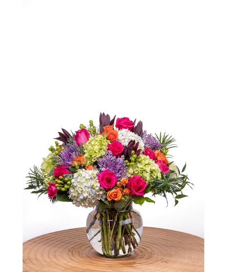 The Dazzling arrangement is sure to turn heads and put a smile on everyone's face - perfect for any special occasion! Featuring roses, hydrangea, and kale purple, this eye-catching display is sure to show your loved ones just how much you care. So whether you're celebrating a birthday, anniversary, holiday, or just because, Dazzling is your go-to gift!
