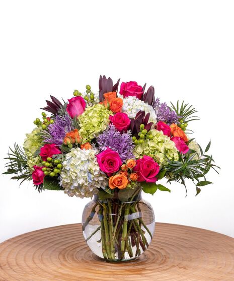 The Dazzling arrangement is sure to turn heads and put a smile on everyone's face - perfect for any special occasion! Featuring roses, hydrangea, and kale purple, this eye-catching display is sure to show your loved ones just how much you care. So whether you're celebrating a birthday, anniversary, holiday, or just because, Dazzling is your go-to gift!