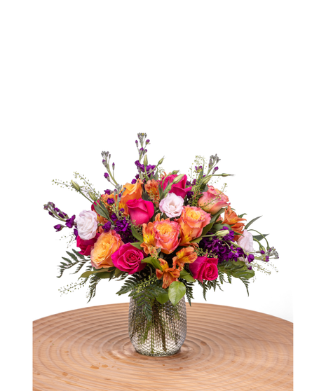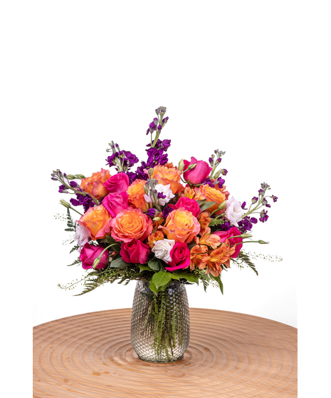 Warm, bold and full of love; Hugs and Kisses is a heartfelt celebration of strength and beauty. Designed with vibrant Free Spirit and hot pink roses, lisianthus, alstroemeria and rich purple stock finished with layered greenery for added texture. It’s the perfect design to honor the incredible women in your life with a message that lasts beyond the blooms.