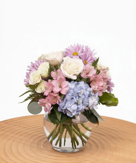 Opalite glows with soft, luminous beauty inspired by the dreamy pastel shimmer of its namesake stone. Light pink alstroemeria, lavender daisies, and creamy white roses create a gentle, uplifting palette, complemented by airy blue hydrangea and fresh eucalyptus. Designed in a glass ginger jar vase, this arrangement feels serene, elegant, and quietly enchanting — perfect for brightening anyone’s day.