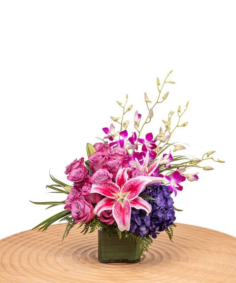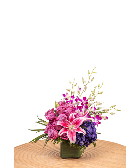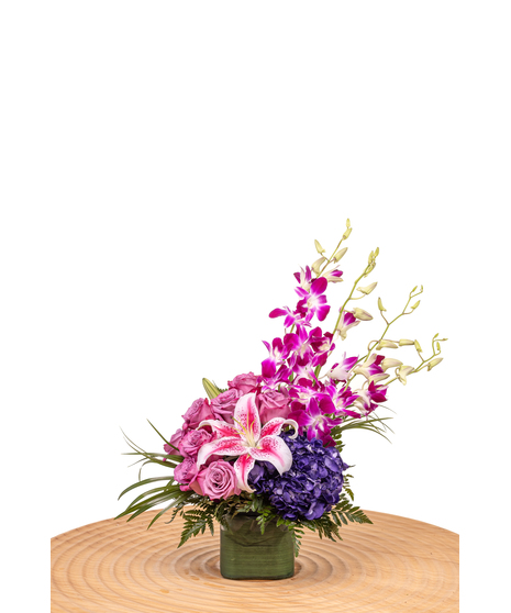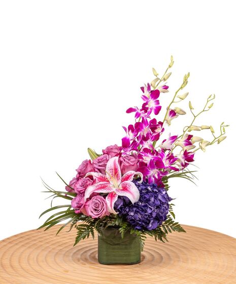 Treat someone special to the gift of Purples in Paris! This flower arrangement features roses, orchids, hydrangea, and lilies accented by green foliage. Your recipient will appreciate the natural beauty and excellent craftsmanship of this floral display for any birthday, anniversary, or special occasion.